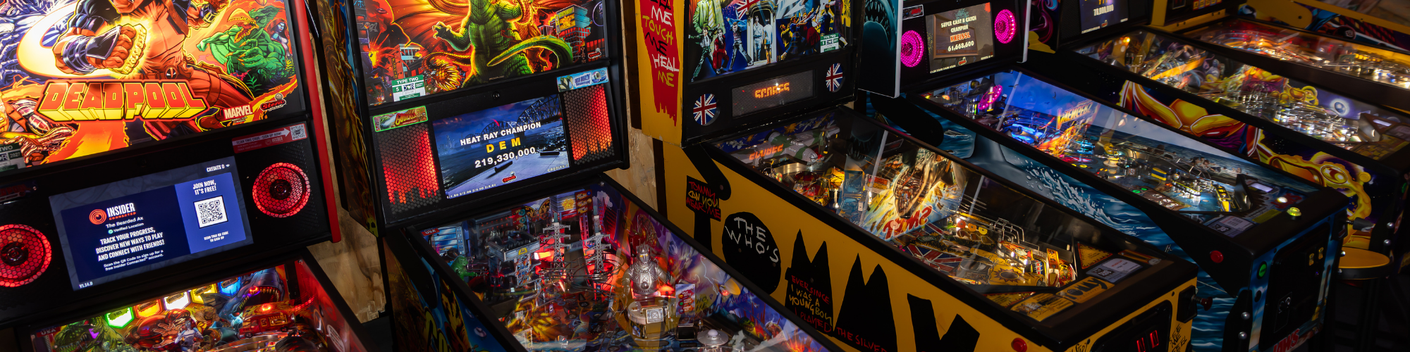 8 pinball machines and Wooden Sword Fighters.